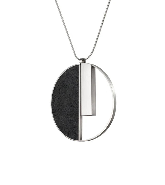 Inspired by the visionary work of Georg Muche and the Bauhaus movement, the Georg Necklace is a bold statement in minimalist design. Crafted from raw concrete infused with diamond dust and paired with brushed stainless steel, this pendant channels the movement’s dedication to geometry, function, and material honesty.