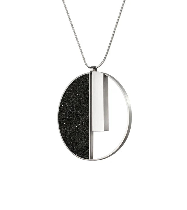 Measuring 46 x 3.5 mm, the Georg pendant is a sculptural tribute to Bauhaus ideals—merging industrial precision with artistic abstraction. The clean lines and tactile surface evoke a timeless modernity, making it a wearable piece of architectural art. Perfect for those who appreciate the intersection of design, craftsmanship, and innovation.