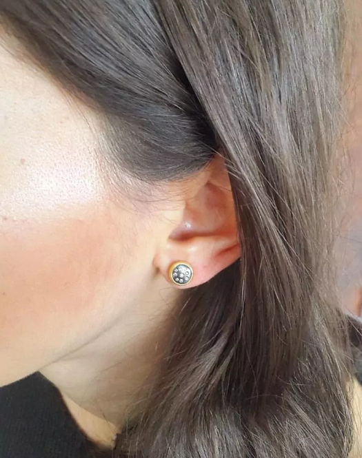 Warm cognac diamonds nestle within oxidized sterling silver bezels, anchored by 22K yellow gold posts in these sophisticated stud earrings. The Pomegranate design pairs precious metals with 0.08 ctw of rich, earthy gemstones—a refined choice that transitions seamlessly from everyday wear to special occasions. Oxidized 8 mm backings ensure secure, comfortable fit.