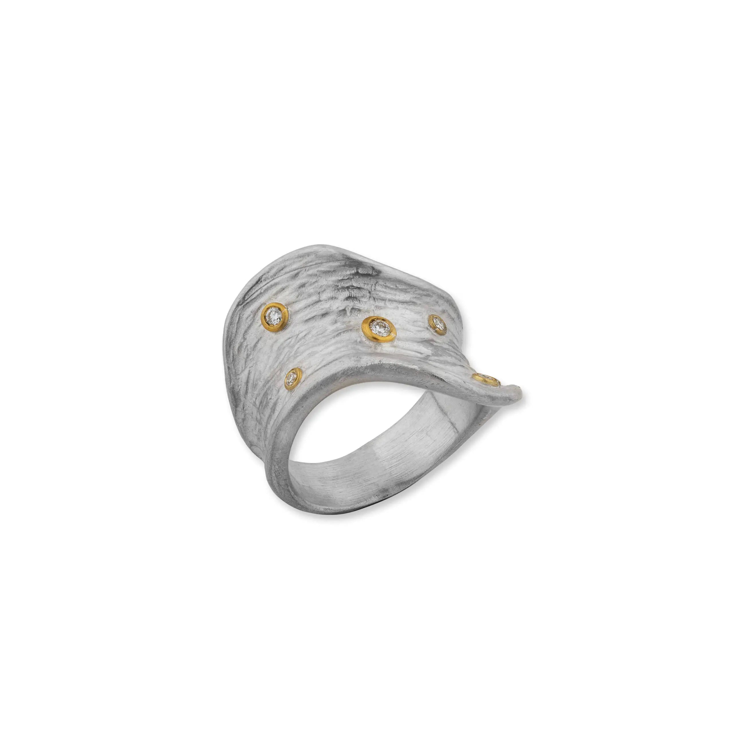 Inspired by nature’s textures, the Bark ring features a matte finish that echoes the rugged elegance of tree bark. Crafted in 24K gold and sterling silver, it’s subtly accented with 0.07 ctw of white diamonds for a refined sparkle. A perfect balance of organic form and modern luxury.