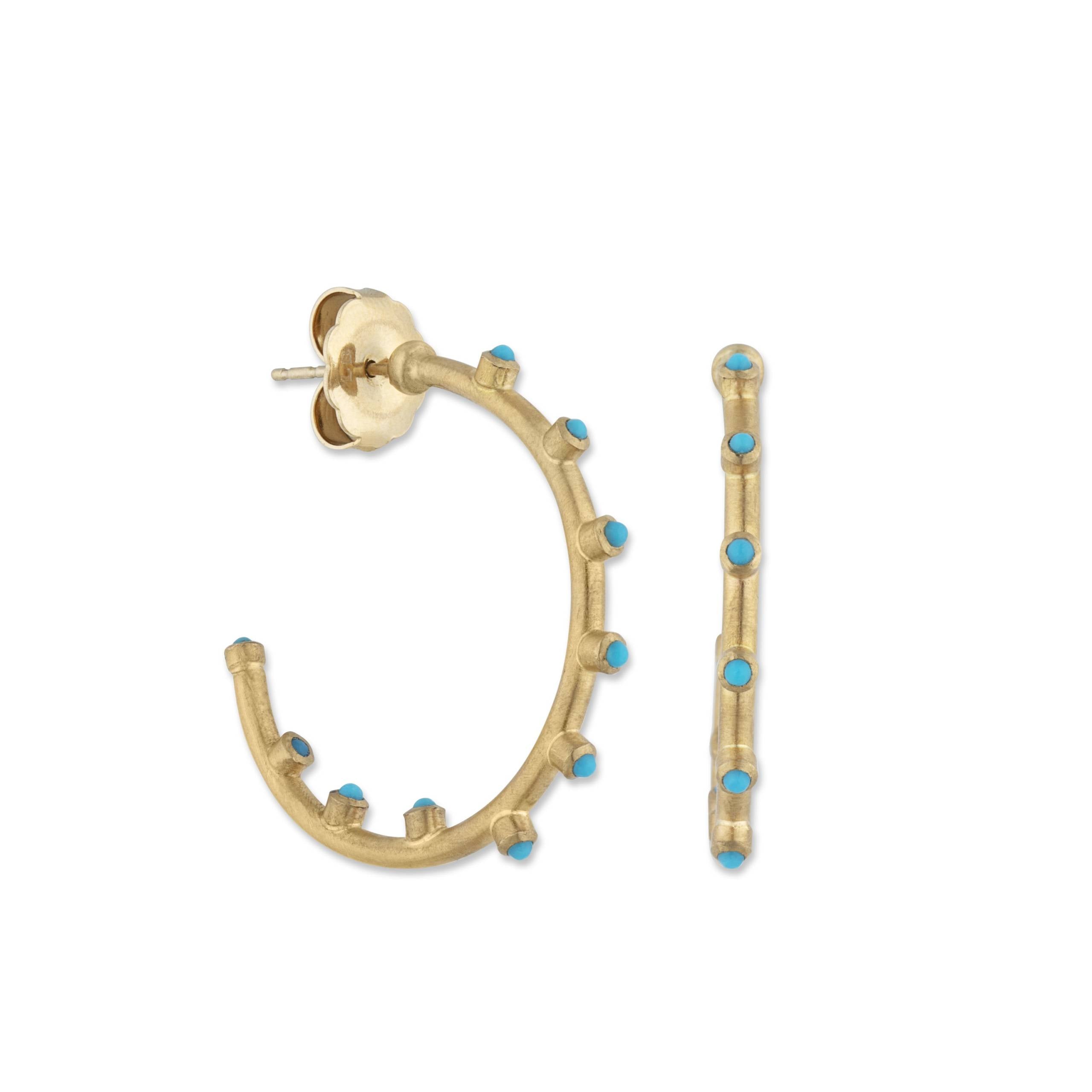 These gold inside-out style hoops feature nine 1.5 mm stunning sleeping beauty turquoise stones on each hoop set in 22k gold bezel on the front and back. Crafted with 22K gold and Sleeping Beauty Turquoise, the stunning stones provide a pop of color and beauty. . Adorned with 18k posts and backings, ensuring comfort and security. These 30 mm gold hoops add a touch of boho shic to any outfit.