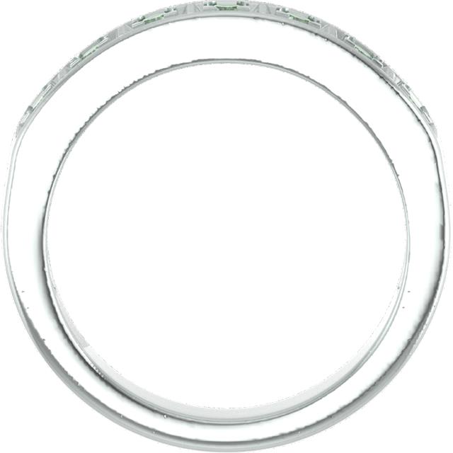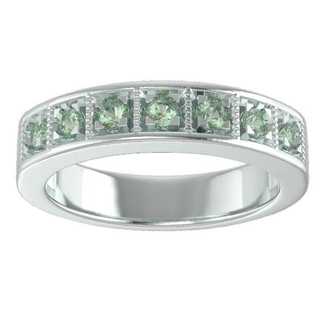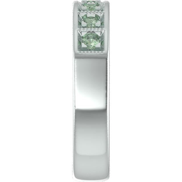 Inspired by a vintage band, this ring features seven green round premium AA quality sapphires in a pinpoint setting with a channel design. Each sapphire is around 2 mm. This timeless band is made with environmentally friendly 100% recycled platinum, which is independently certified. The band is 4 mm wide all the way around, the top is around 2.25 mm high with the stone, and the bottom thickness can be 1.3-1.4 mm thick. This band can be customized as a family or birthstone ring. All stones are conflict-free diamonds or ethically sourced gemstones. This ring is also available in 18k white gold, rose gold, and yellow gold.