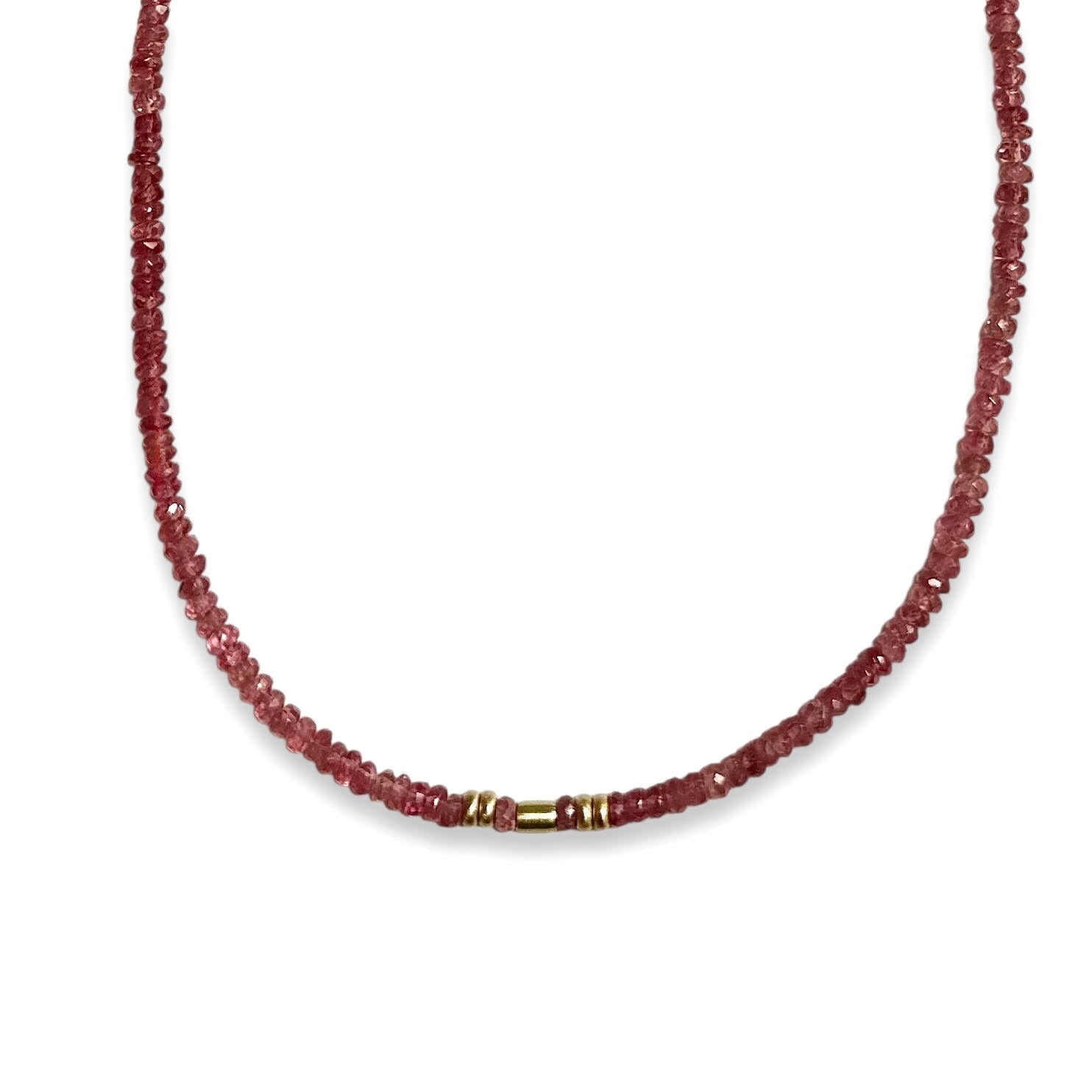 A graceful strand of natural pink tourmaline beads brings soft color and subtle sparkle to this timeless necklace. Accented with a single 18K gold bead for a touch of warmth and luxury, the piece is finished with a 14K gold adjustable clasp, allowing versatile styling and a perfect fit. Whether worn alone or layered, this necklace offers refined beauty with a delicate, feminine edge.