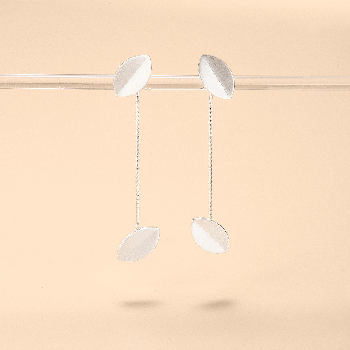 These long leaf drop earrings feature sleek matte sterling silver elements suspended from delicate chains. The modern leaf-shaped design adds soft movement and an elegant, sculptural touch. Lightweight and refined, they elevate any look with effortless sophistication.