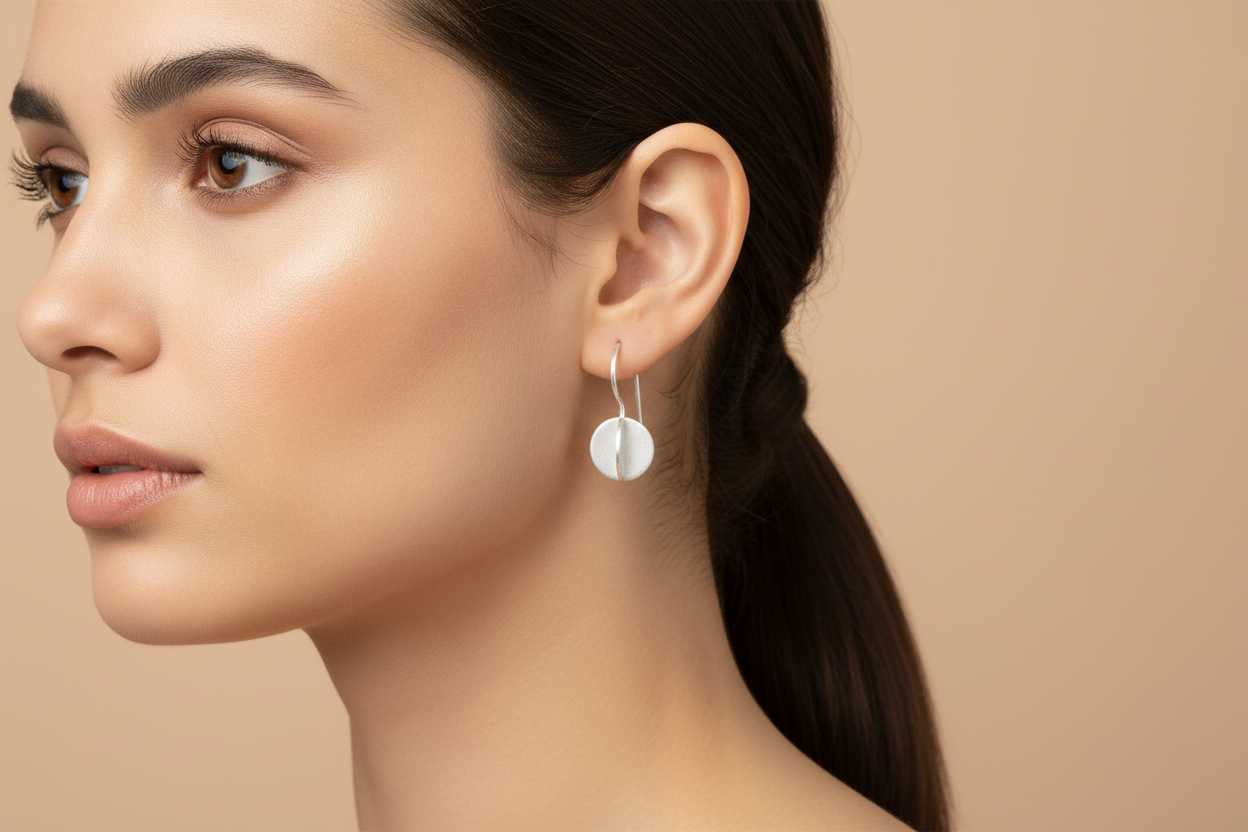 These contemporary earrings feature a round, brushed sterling silver disc with a distinctive folded center that adds depth and dimension. The minimal yet artistic design creates a dynamic visual contrast, offering both texture and movement. Lightweight and modern, they hang gracefully from simple hooks, making them perfect for both everyday wear and elegant occasions. A refined statement piece for lovers of clean, sculptural design. 0.75" long, 0.33" wide.