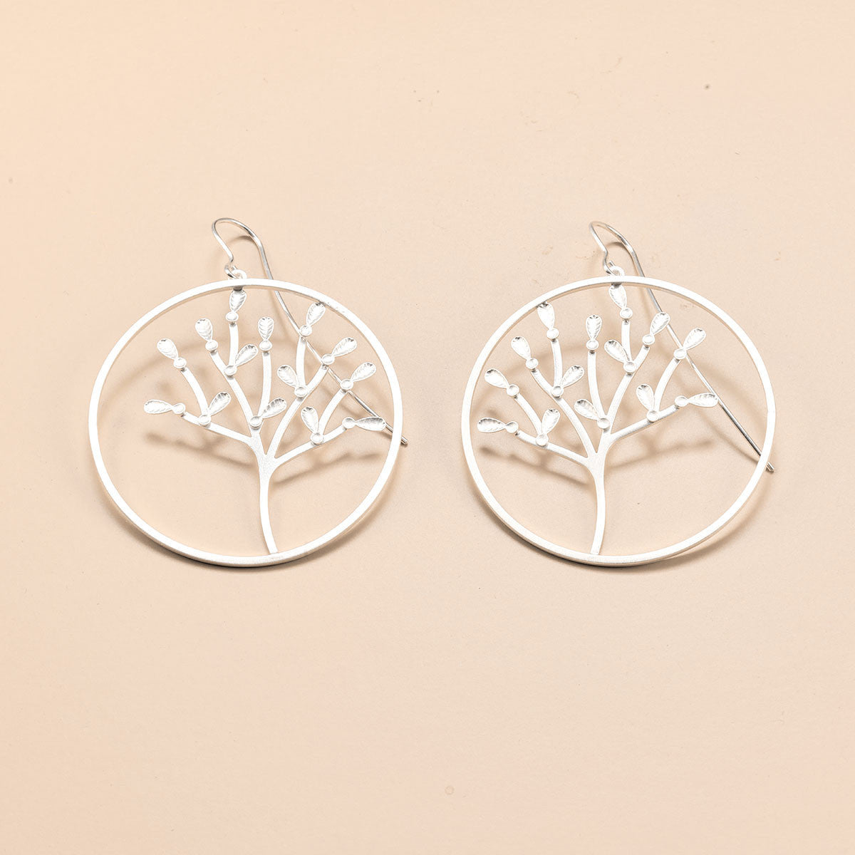 These statement earrings from Kelim Jewelry feature a pair of tree branch designs with delicate negative space, suspended in a 30 mm hoop attached to sterling silver ear wires. Measuring 2.25" in length including the ear wire, they are lightweight and comfortable, perfect for making an elegant impression in everyday settings.