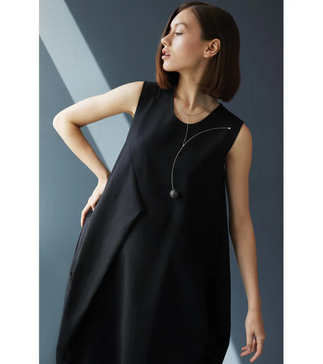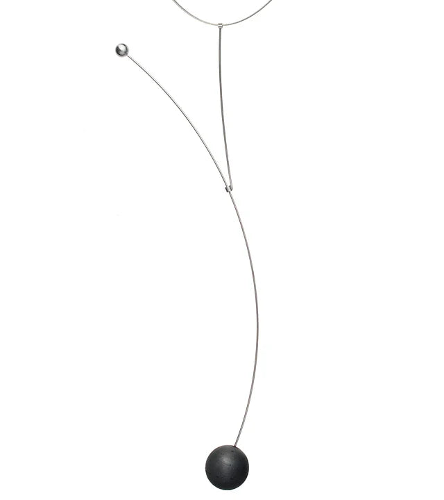 Beautifully balanced and boldly minimalist, the Mathilde Necklace features a striking 1″ concrete sphere suspended below a smaller polished stainless steel ball. The dual spheres are threaded on an adjustable chain, allowing you to slide the pendant up or down to suit your look—wear it high and sculptural, or let it hang low and grounded.