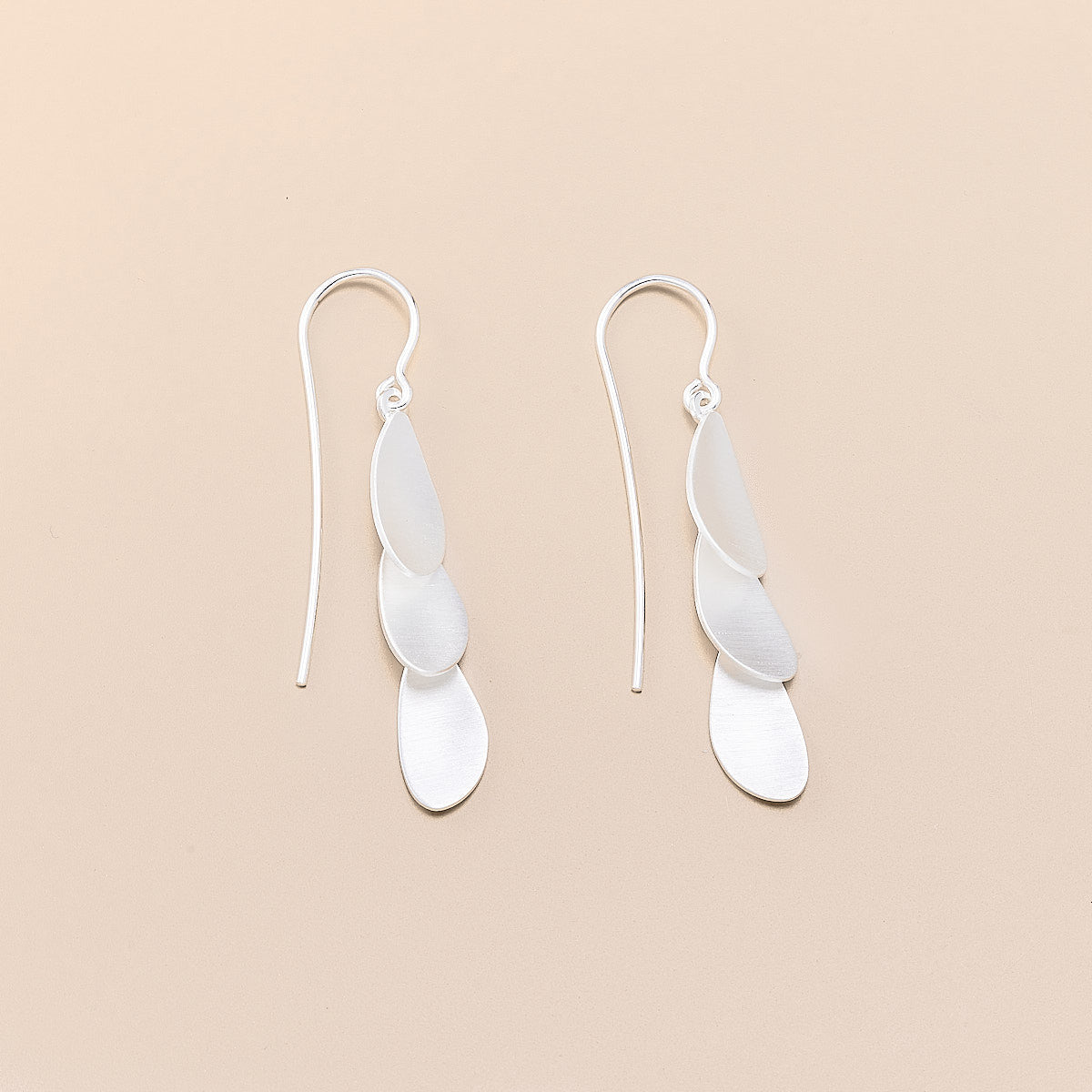 Delicate movement, effortless elegance. These sterling‐silver earrings feature three softly brushed petal shapes cascading in a gentle drop. Lightweight and graceful, they create a subtle shimmer with every turn — perfect for both everyday wear and refined occasions.