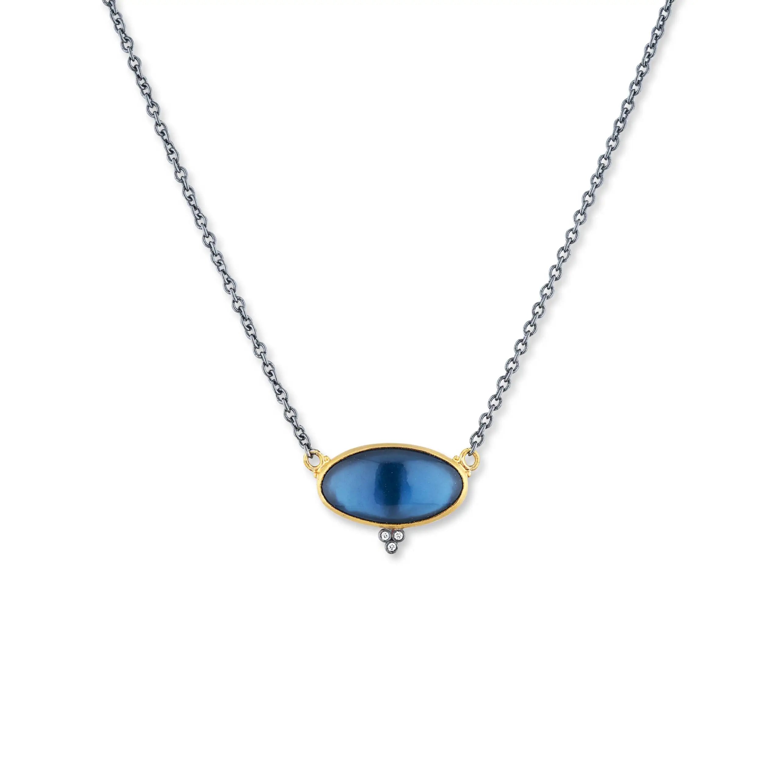 Inspired by the timeless allure of the sea, the Mare Nostrum Necklace is an elegant fusion of 24K gold and oxidized sterling silver. At its heart lies an oval London Blue Topaz and Mother of Pearl doublet (9.53 ctw), radiating deep ocean hues. A delicate touch of white diamonds (0.03 ctw) adds a glimmer of light, while the adjustable oxidized silver chain ensures a graceful fit at 18". Sophisticated and evocative, this piece captures the depth and mystery of the Mediterranean spirit.