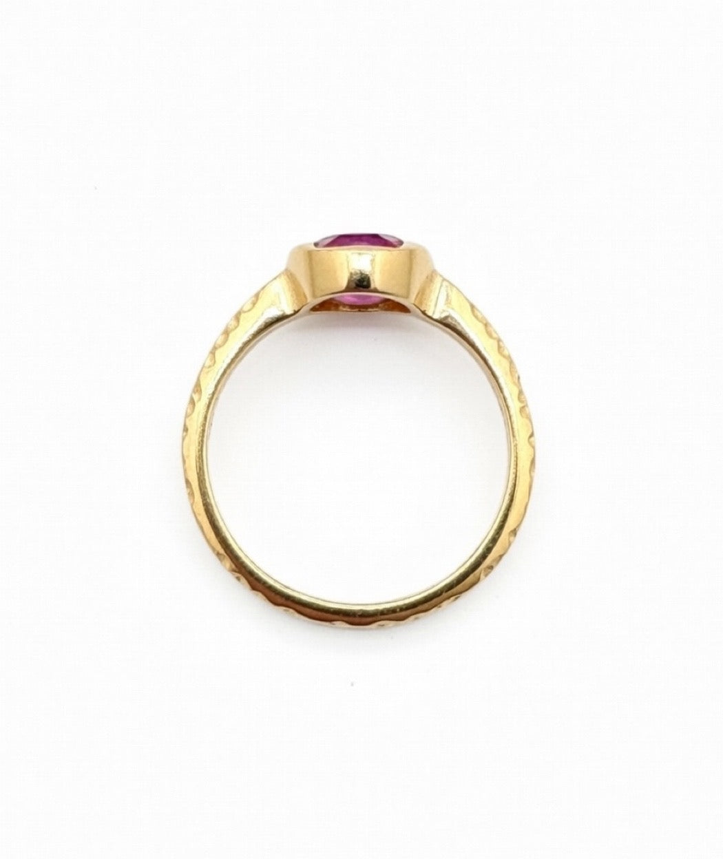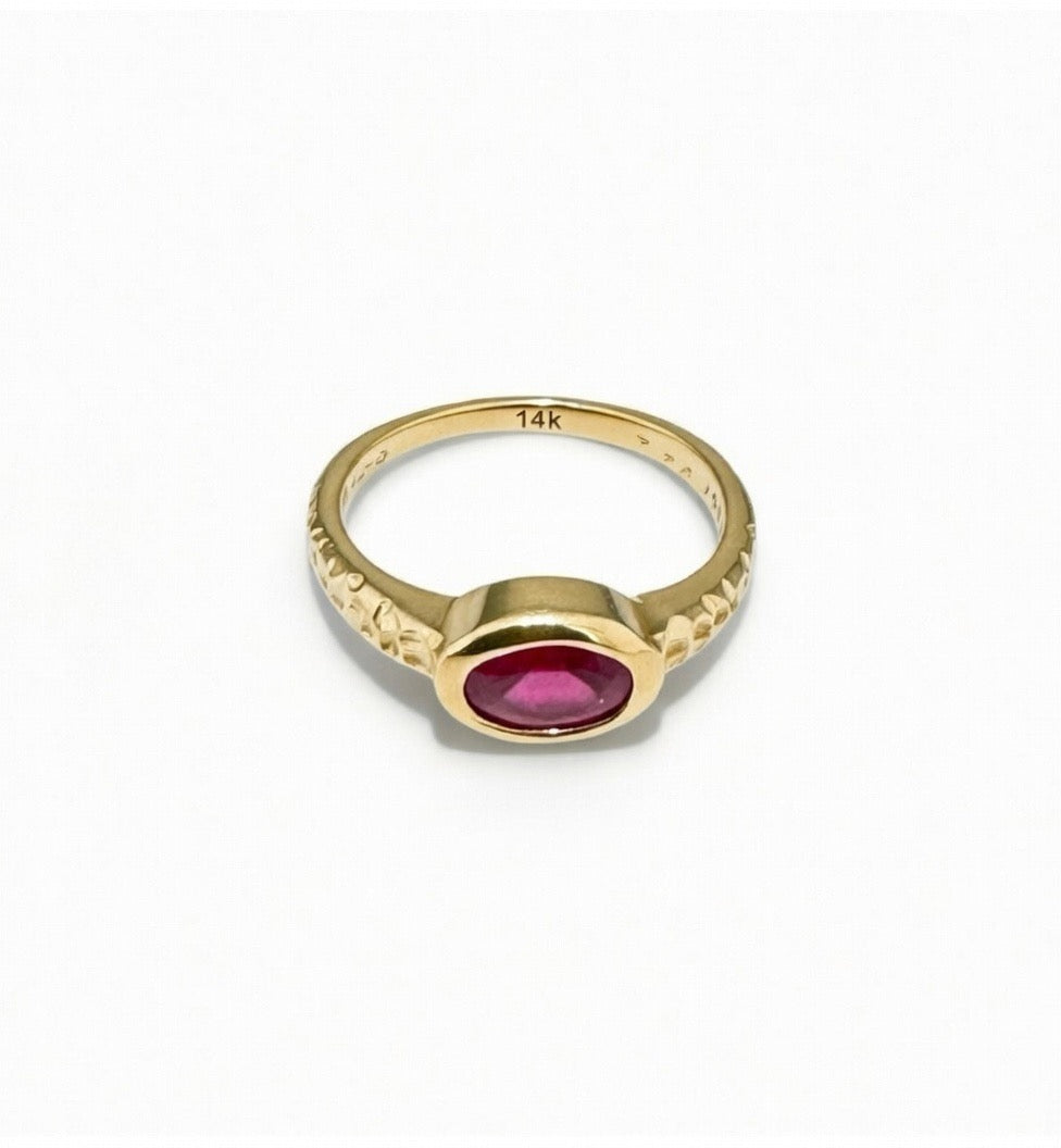Oval Ruby Bezel Set Solitaire Engagement Ring with Hammered Texture