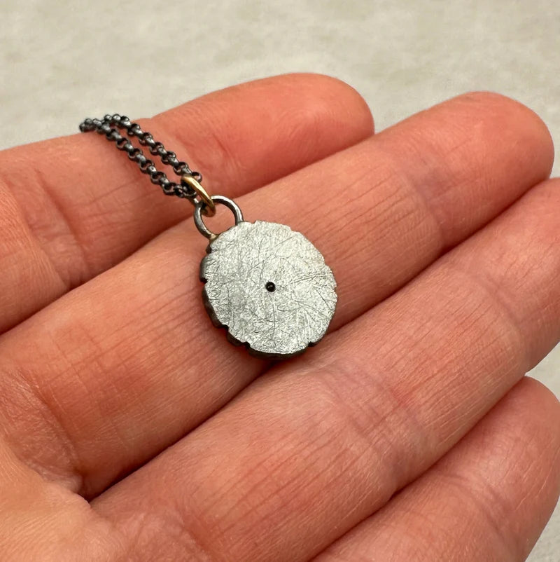 Inspired by the enduring beauty of the redwoods, this refined pendant features a flush-set white lab-grown diamond at its center, symbolizing a moment of light within nature. Concentric “tree rings” of textured, oxidized sterling silver radiate outward, accented with warm 23K gold for rich contrast and organic depth.