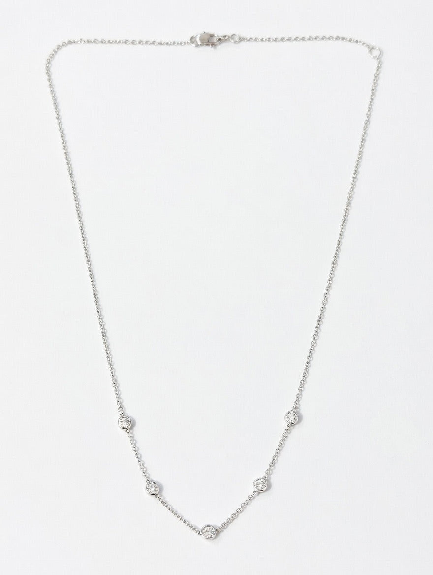 Five lab-created diamonds, each 2.5mm and F+ color with VS clarity, are bezel-set in 14k white gold and spaced 0.5" apart along this refined station necklace. The 1.3mm white gold cable chain is rhodium-plated for lasting brilliance. The necklace has 16" and 18" adjustable lengths. Custom-made to order.