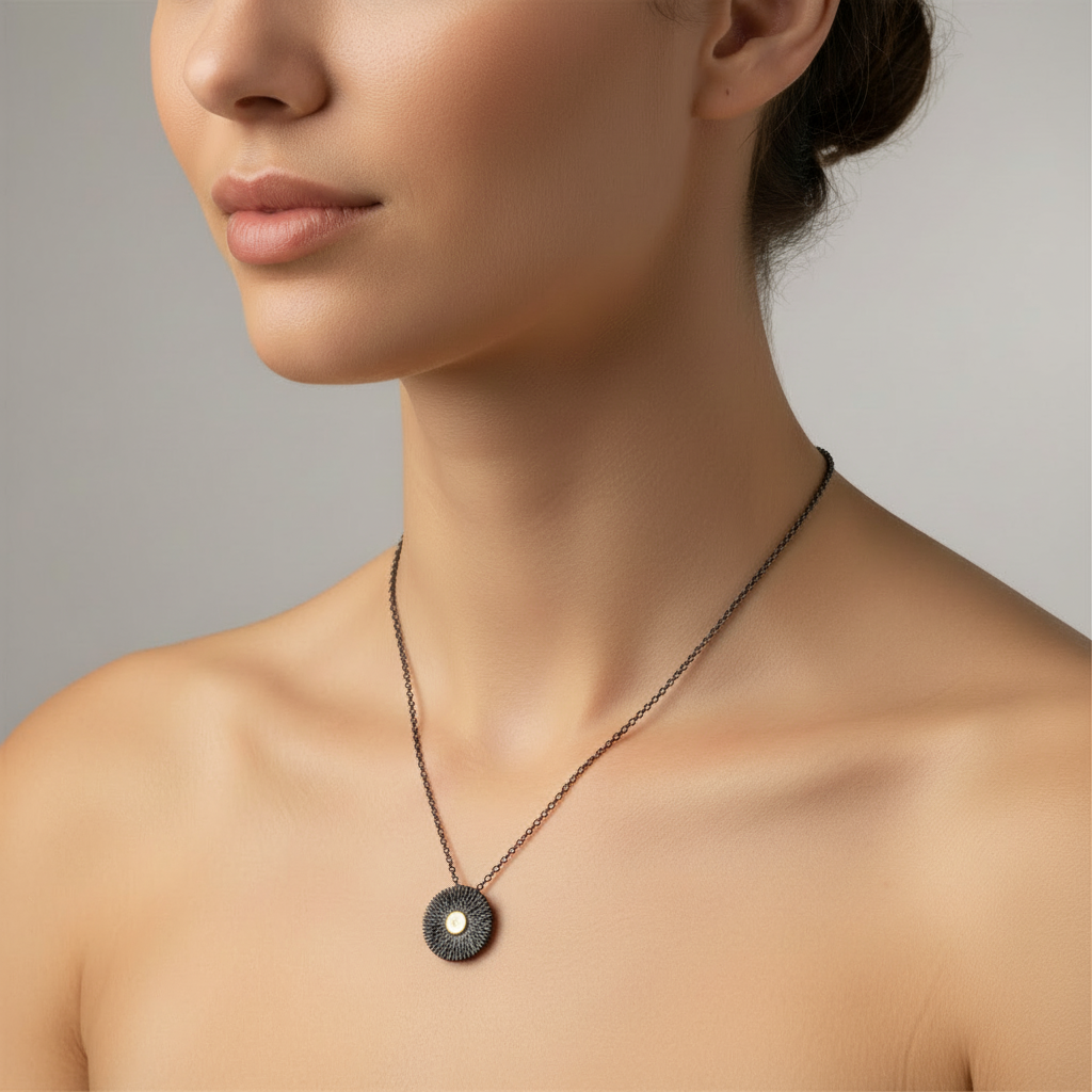 Crafted in 925 sterling silver with a glowing 18K gold center, this pendant evokes the brilliance of the sun. A finely textured circular design highlights a sparkling diamond (0.016 ct), bringing elegance and light to your everyday style. A modern yet timeless piece that shines effortlessly.