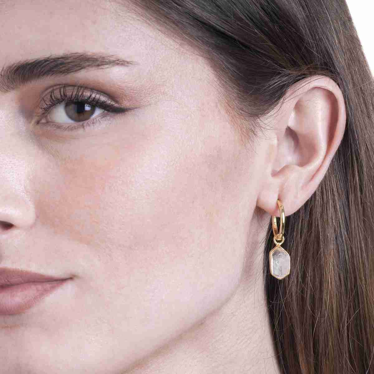 These Herkmer Earrings represent a masterclass in versatile design, made from Sterling Silver 925 and finished with 18k Gold plating. Each earring showcases a faceted Herkimer Diamond Quartz, celebrated for its exceptional transparency and energetic qualities. Measuring 33mm, they offer the perfect scale for seamless integration into any wardrobe. The defining feature is their dual-wear capability—simply detach the crystal drops to reveal sleek endless style hoops, or keep them secured for a more pronounced aesthetic, delivering two distinct looks from a single refined investment. These Herkimer Earrings celebrate the singular nature of authentic gemstones—each pair is genuinely one-of-a-kind. The natural variations inherent to real stones ensure your earrings possess their own distinctive character, making them a truly personal and irreplaceable addition to your collection.
