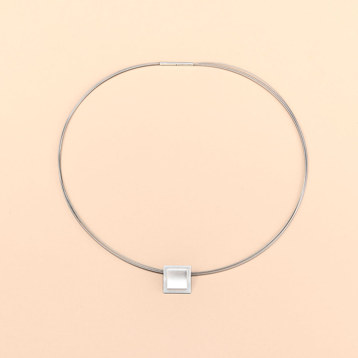A minimalist pendant necklace featuring a modern square design crafted in satin-finished sterling silver. The clean geometric lines and subtle matte texture create a refined, contemporary look — perfect for both everyday wear and elegant occasions.