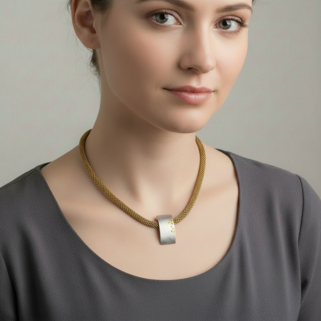The diamond rectangle pendant is fused with 18k yellow gold and accented with brilliant diamonds 0.07 CTW, VS1 clarity. The pendant has two female vario clasp ends that can work with any chain that has male vario ends. Create various looks with various chains. Pendant only. Recommended to wear with Goldie silver mesh chain.