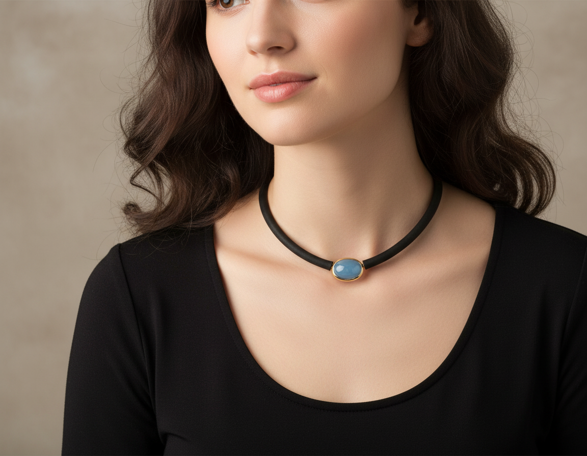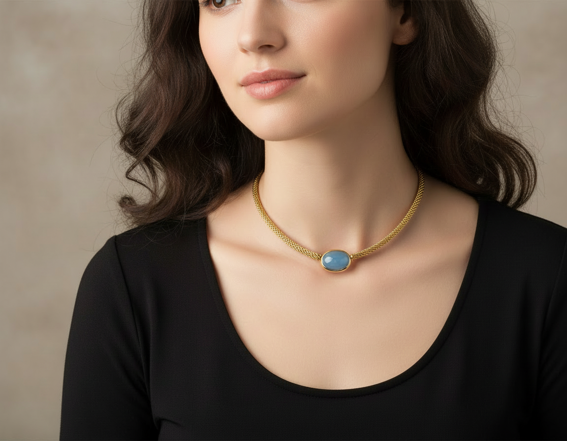 This sophisticated necklace features a polished oval Aquamarine cabochon secured within an 18K gold bezel secured with various clasps. Expertly handcrafted, this necklace is intended to be a lasting accessory over time. It is advisable to pair it with a black or gold mesh chain; pendant only. Produced by a master jeweler, this necklace is poised to be a valued addition to any collection for years.