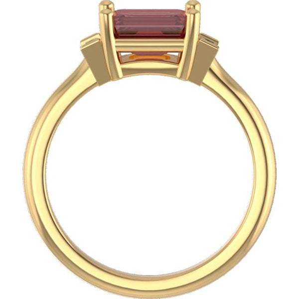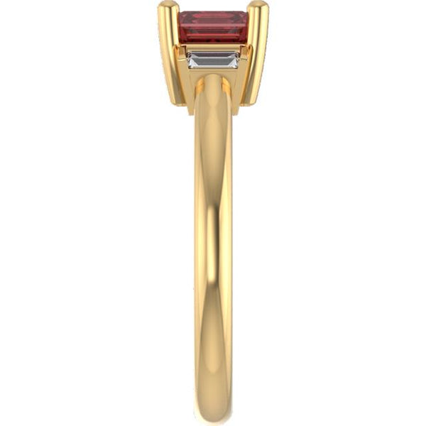 This charming 14k yellow gold three stone engagement ring features a 7x5 mm Emerald cut lab-created Ruby horizontally set in 4-prong setting and two 3x1.5 mm straight Baguette cut white Moissanite in bar channel setting. The shank is approximately 2...