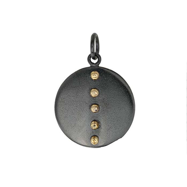 Description This handcrafted sterling silver charm features a round shape with a row of bright bronze granulation beads in the center against a dark, oxidized background. The charm makes an eye-catching necklace on its own or combined with other design...