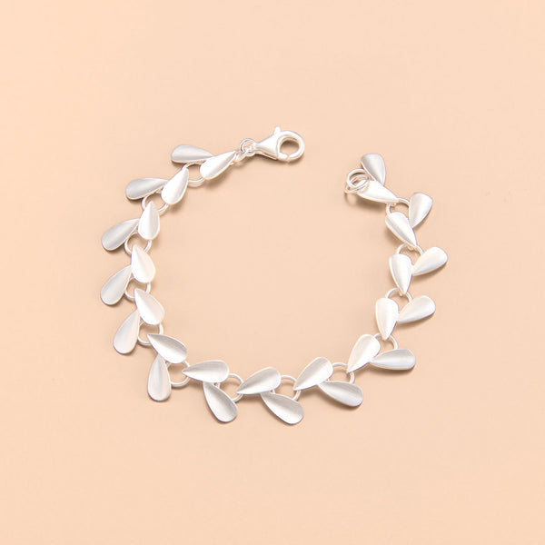 This simple modern Multi Teardrop Bracelet is made of 925 Sterling Silver with an understated matte finish. The elegant leaf-like bracelet is 12mm wide, 7.75- 8" long with a lobster claw clasp.