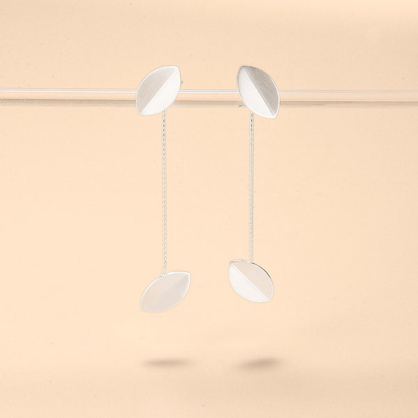 These long leaf drop earrings feature sleek matte sterling silver elements suspended from delicate chains. The modern leaf-shaped design adds soft movement and an elegant, sculptural touch. Lightweight and refined, they elevate any look with effortless sophistication. Material: Matte Sterling...