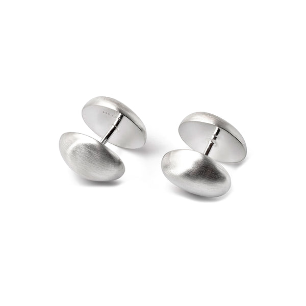 These cuff linksĀ feature two oval, dome-shaped sterling silver tops with a subtle, matte finish. The large oval dome top measures 19 mm long (0.75") in diameter, and the smaller side is 15.5 mm (0.60") and 18 mm long ( 0.72")...