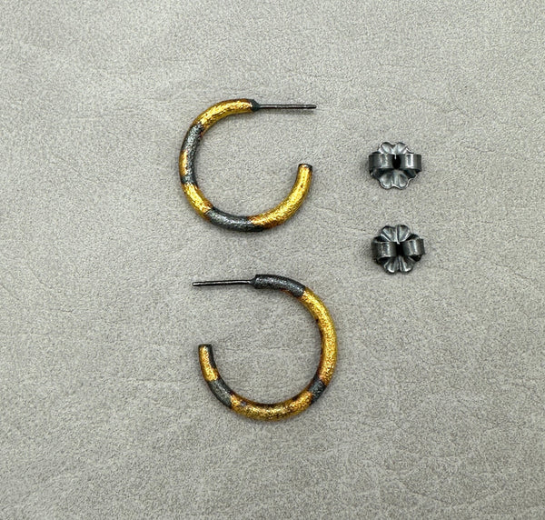 A classic hoop infused with ancient vibes, these textured earrings in oxidized silver—kissed by 23K gold—evoke treasures fresh from an archaeological dig. Small and spunky, they're the ideal everyday size, blending rustic texture with subtle golden warmth. Recycled oxidized sterling...