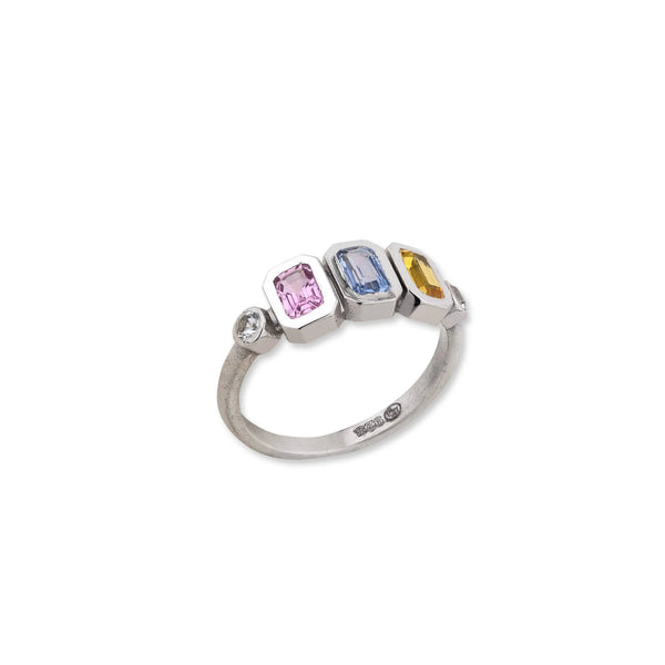 Celebrate life with a splash of color and sparkle with the PRIZMIC ‘HAPPY’ Ring. Crafted in luxurious matte sterling silver, this stunning piece features a vibrant array of faceted sapphires in shades of blue, pink, yellow, and white, creating a...