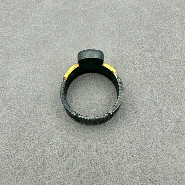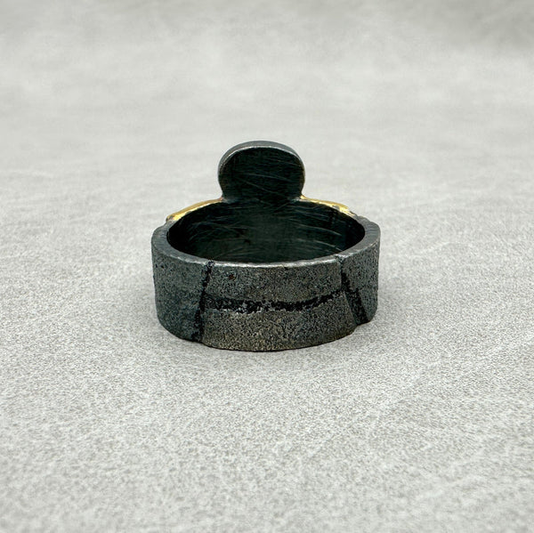 Evoking the lines, colors, and contrasts of a sun-kissed shoreline, the Seafoam Band blends organic texture with luminous detail. This wide oxidized sterling silver band features flowing, beach-inspired contours, accented with warm 23K gold and a vibrant Arizona turquoise cabochon...