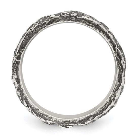 This sterling silver ring exemplifies understated organic elegance with its textured surface and antiqued patina. Constructed from 925 sterling silver and weighing 7.85 grams, the 6.1mm band offers a refined silhouette that complements any style. The closed-back design ensures structural...
