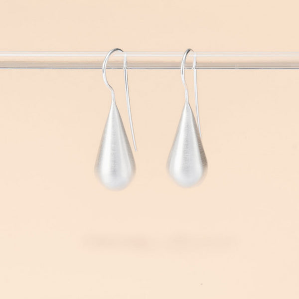 These Tear Drop earrings are made in sterling silver with an understated matte finish, great for everyday wear. 1.32" (34mm) long including ear wire, and 0.4"  (10.5 mm) wide.