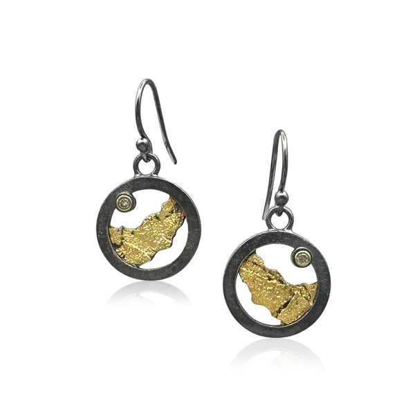 Reminiscent of sweeping landscapes captured in miniature, these lightweight drop earrings blend oxidized silver's earthy depth with the warm glow of 23K yellow gold and subtle sparkle from champagne diamonds. Perfect for everyday wear, they offer effortless elegance with secure...
