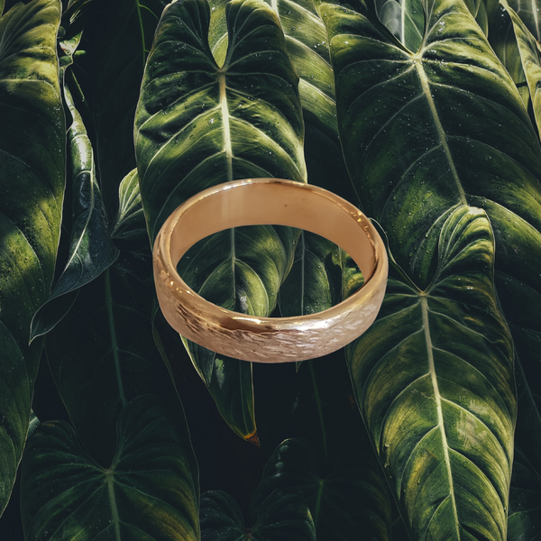 This 10k wedding band for men features a unique woodgrain pattern in matted yellow gold. The flat band has comfortable rounded edges measures 5mm wide, and features curved edges for an organic touch. This handmade textured band is also available...