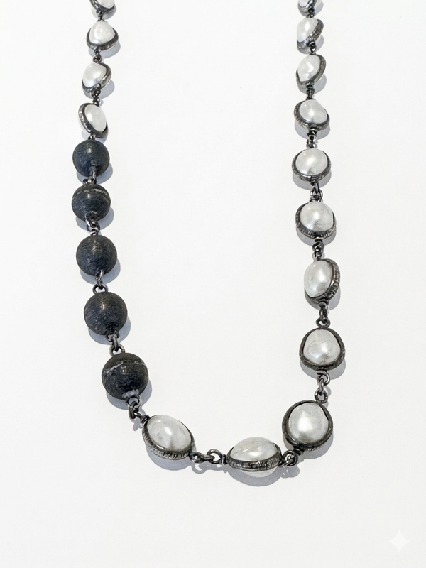 This striking pearl necklace combines the timeless elegance of freshwater pearls with the artistry of handcrafted sterling silver. Each necklace features luminous beveled freshwater pearls measuring approximately 11–13 mm, creating a natural variation that makes every piece truly unique. Handmade...