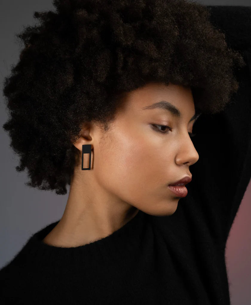 Crafted in powder-coated stainless steel, these studs offer a refined architectural presence with a lightweight feel—designed to frame the face with subtle strength and intention.