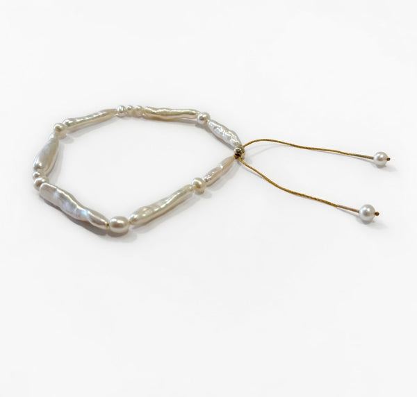 The Biwa Row Bracelet combines modern minimalism with organic beauty. Featuring striking white freshwater Biwa pearls paired with delicate seed pearls, this bracelet is hand-strung on a durable gold-colored nylon cord for a lightweight yet resilient finish. Its adjustable design...