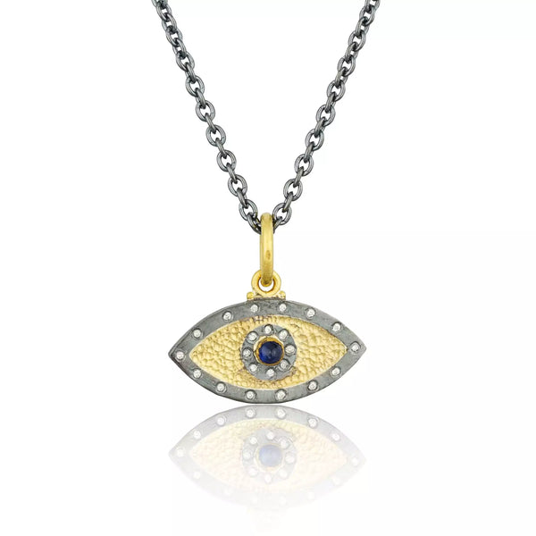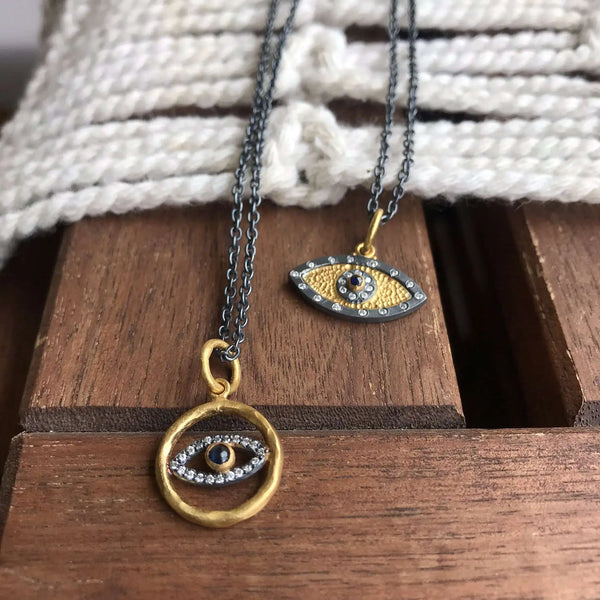 The Chase Pendant is a bold yet elegant piece, blending 24K gold and oxidized sterling silver to create a striking evil eye design. Adorned with sparkling diamonds of 0.09 ctw diamond and 0.10 c blue sapphire, this pendant symbolizes protection and mystery,...