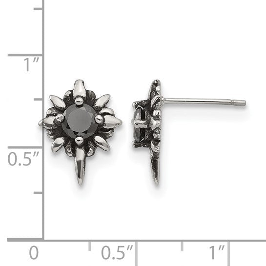 Elevate your style with the edgy stainless steelĀ button earrings, featuring a polished and antiqued finish. These earrings showcase a striking black cubic zirconia (CZ) set in durable stainless steel, offering both modern elegance and lasting durability. With a secure post...