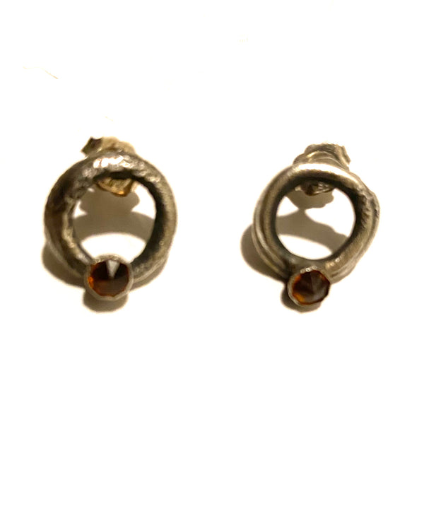 sterling silver handmade post earrings with round 4mm dark orange color citrine pointy side up, circle is 0.5" (13mm) in diameter, distressed industrial finish.