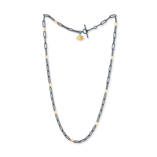 Elevate your jewelry collection with the distinctive CLIPSKI 20″ Adjustable Chain, showcasing a bold blend of oxidized sterling silver and rich 22K yellow gold. The highlight of this piece is the Silox toggle detail, crafted with precision and paired with...