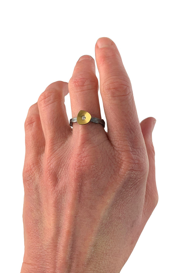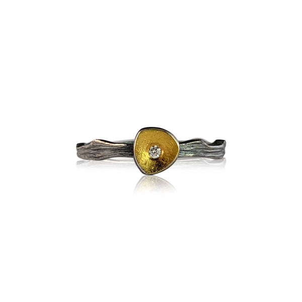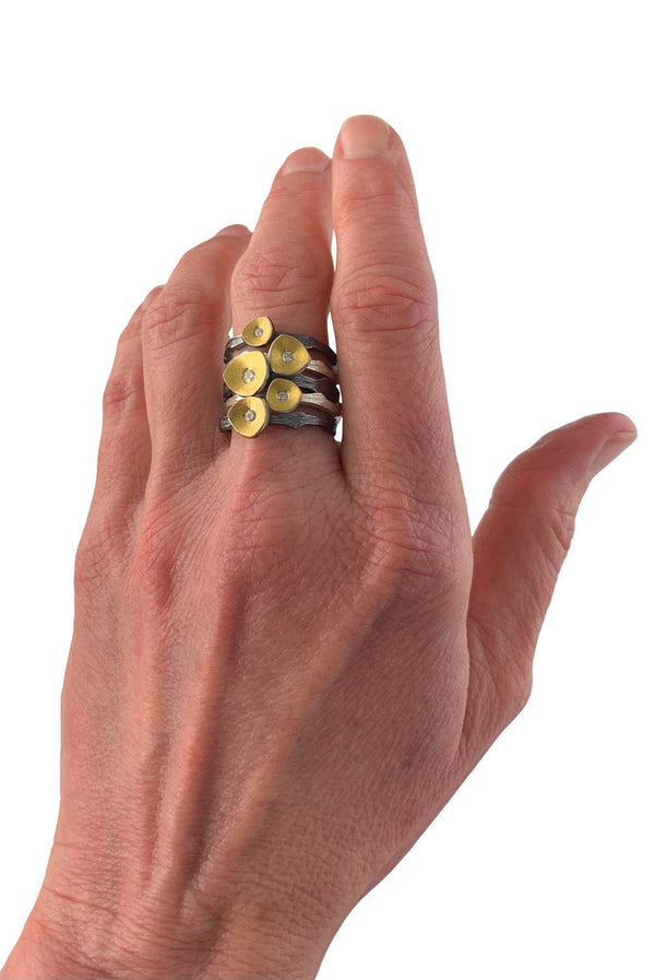 Inspired by the delicate shimmer of water droplets on cloud forest branches, these stacking rings feature responsibly sourced white diamonds nestled in concave “droplets” accented with 23K gold. Set on bands of intricately carved bright silver, they beautifully evoke the...