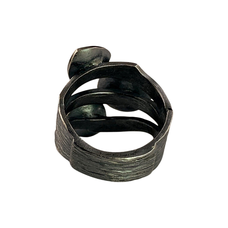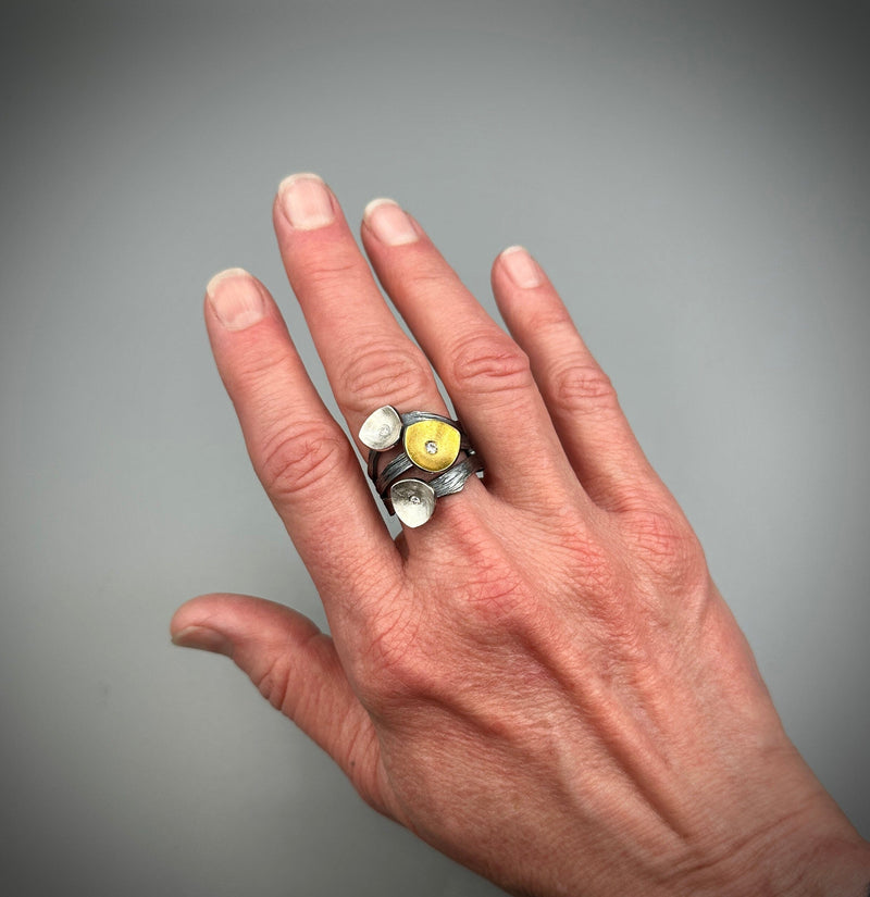 Enhance your style with the Cloud Forest Triplet Ring - OX, expertly crafted to feature a striking triplet design. Perfect for both refined occasions and daily elegance, this bold, nature-inspired ring combines comfort with artistic flair. Three silver and gold droplets rest on a carved, textured oxidized silver band, reminiscent of dew glistening on a branch. Its chunky silhouette highlights contrasting textures and finishes, making it a distinctive statement piece.