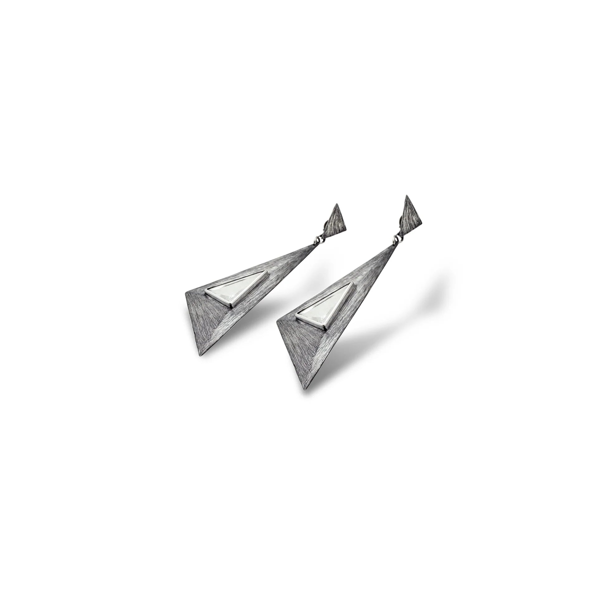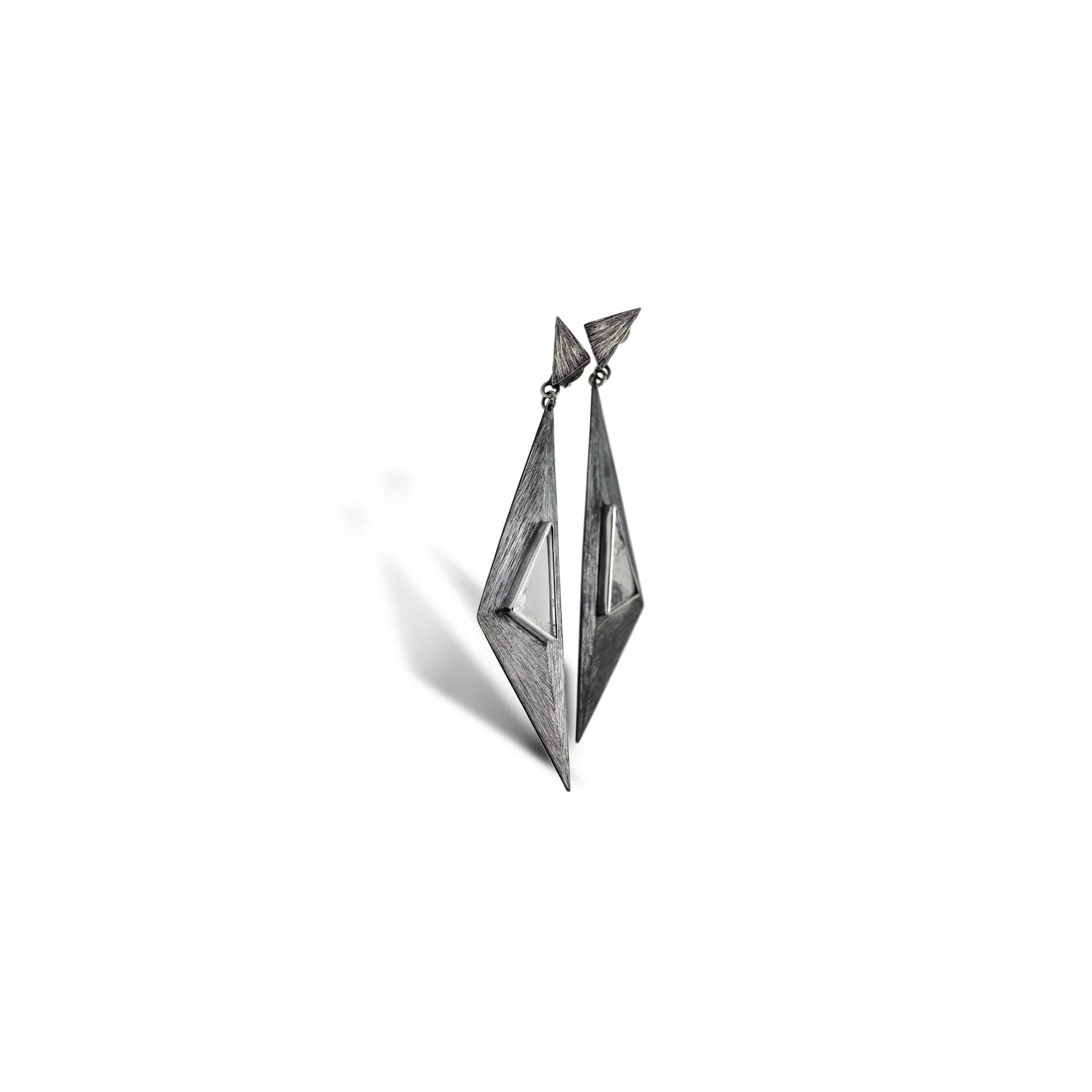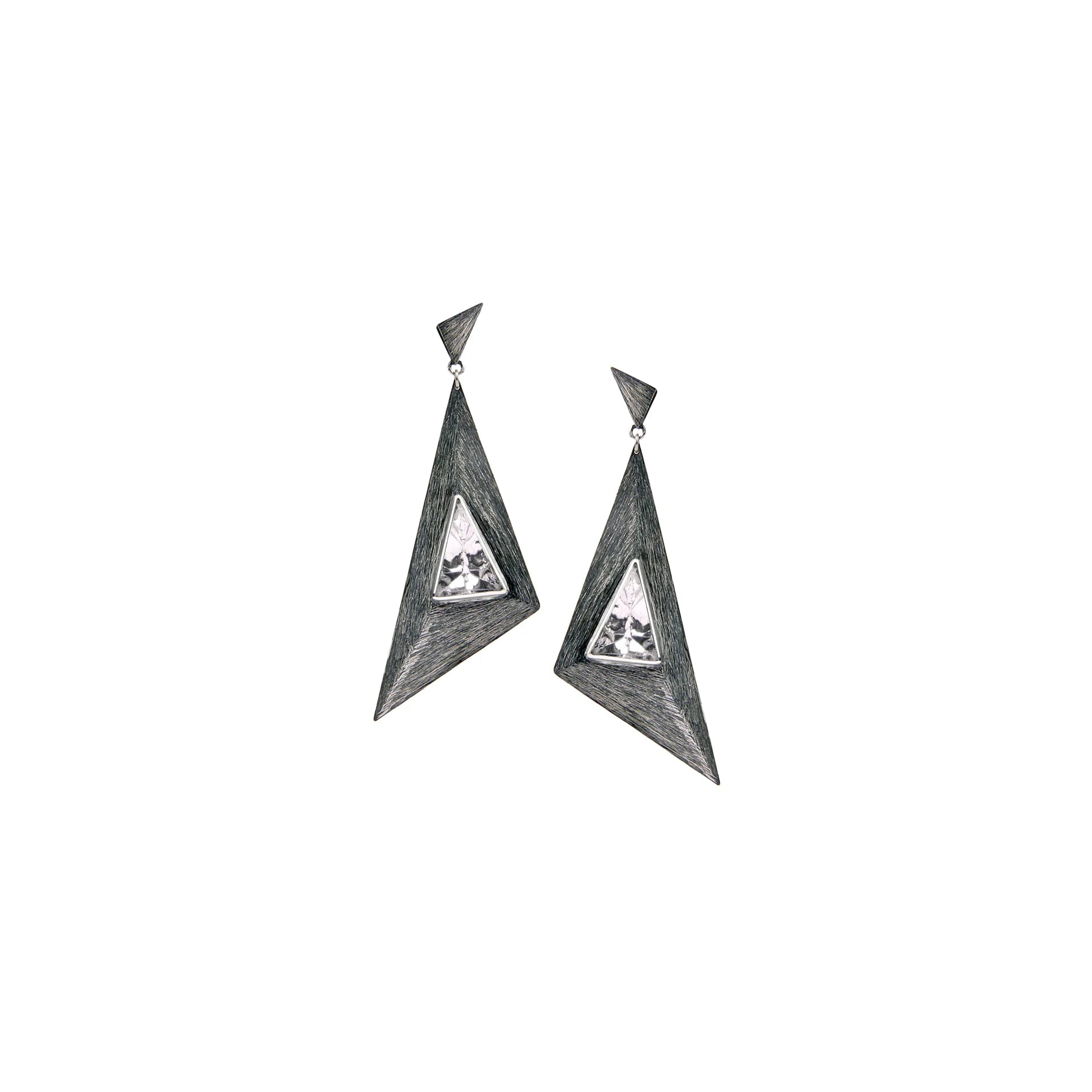 Silver, handmade, natural crystal, etched oxidized silver Crystal Triangle Earrings 2.8" (71mm) long and 1.10" (28mm) wide