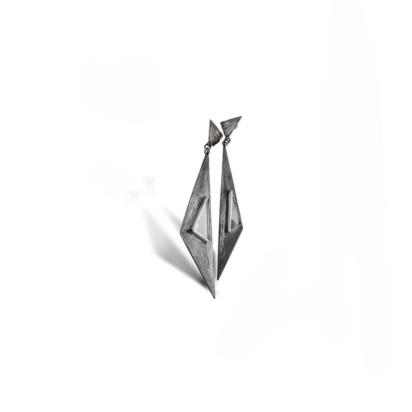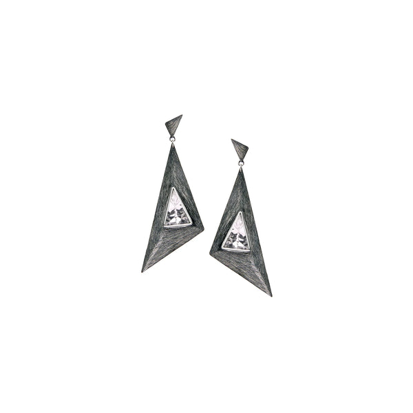 Silver, handmade, natural crystal,  etched oxidized silver Crystal Triangle Earrings 2.8" (71mm) long and 1.10" (28mm) wide