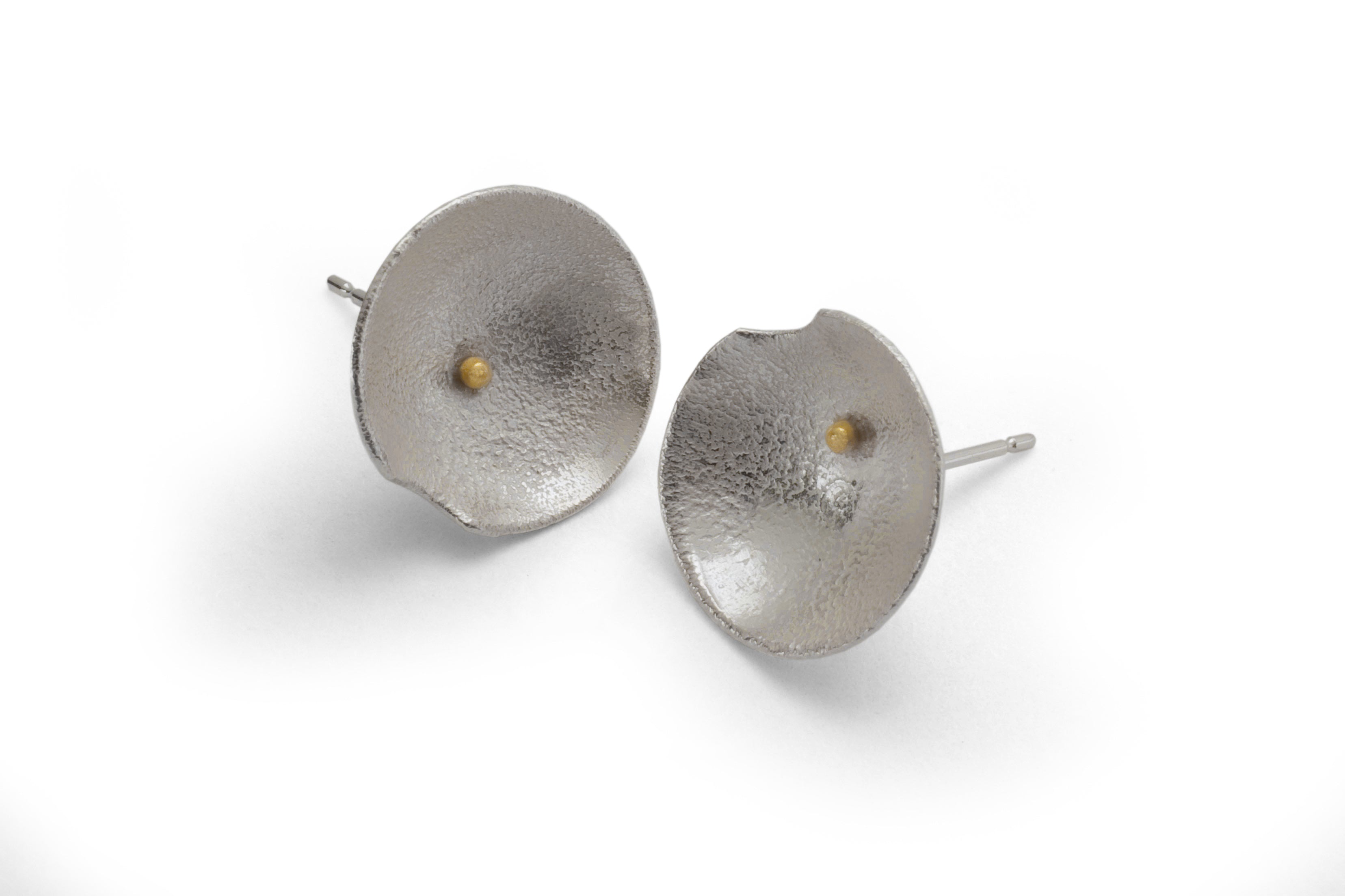 The Daisy Studs feature hand-formed sterling silver cups, textured through reticulation to create light-catching, organic surfaces. A single 18ct yellow gold bead sits at the centre of each cup, adding a warm contrast to the cool silver tones.