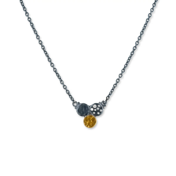 Elevate your jewelry collection with the timeless elegance of the DORA Necklace. Crafted with a striking fusion of 24K gold and oxidized sterling silver, this piece exudes a refined contrast of warmth and depth. The necklace features 0.07 carats total...