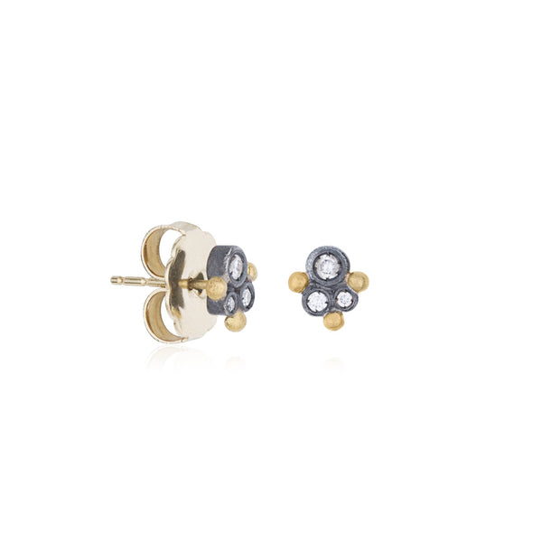 "DYLAN" small stud EARRINGS WITH GOLD AND DIAMONDS. Made with Solid 24K gold fused with oxidized silver, 18k gold posts &backings approximately 6 mm, handmade. Great for everyday fashion.