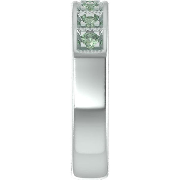 Inspired by a vintage band, this ring features seven green round premium AA quality sapphires in a pinpoint setting with a channel design. Each sapphire is around 2 mm. This timeless band is made with environmentally friendly 100% recycled platinum, which...