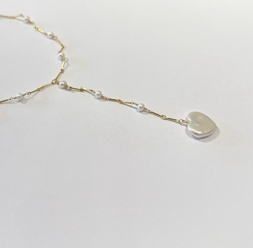 Lariat Heart Necklace with Rare White Freshwater Heart Shape Pearl and White Seed Pearls