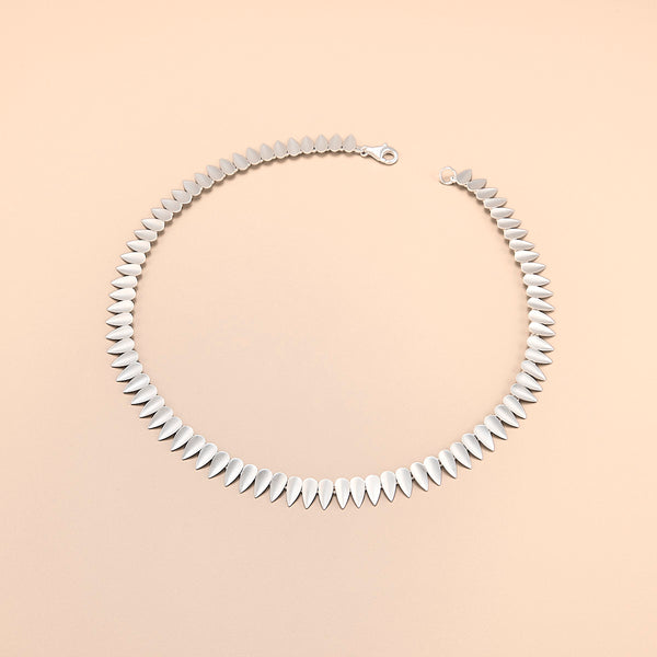 This simple and modern necklace features a slightly curved shield motif and is expertly linked individually for artistic expression and wearing flexibility. It is crafted from sterling silver with a subtle matte finish. Each silver shield is about 10.4mm long...